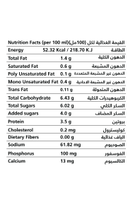 المكونات: مسحوق حليب بقري، سكر،ماء نقي، مستحلب ومثبت مصرح به (أسيتيلاتد ثنائي النشا أديبات إي1422، أميدات البكتين إي440، أحادي و ثنائي جليسريدات الأحماض الدهنية من زيت النخيل إي471، ألجينات الصوديوم إي401، أجار إي406)، نكهة الموز المماثله للطبيعة، يحتوي على 2% دسم كحد أقصي، 8.5% كحد أدنى مواد صلبة حليبية لا دهنية، ومدعم ب 400 وحدة دولية من فيتامين (د) و1320وحدة دولية من فيتامين (أ) لكل لتر.