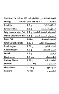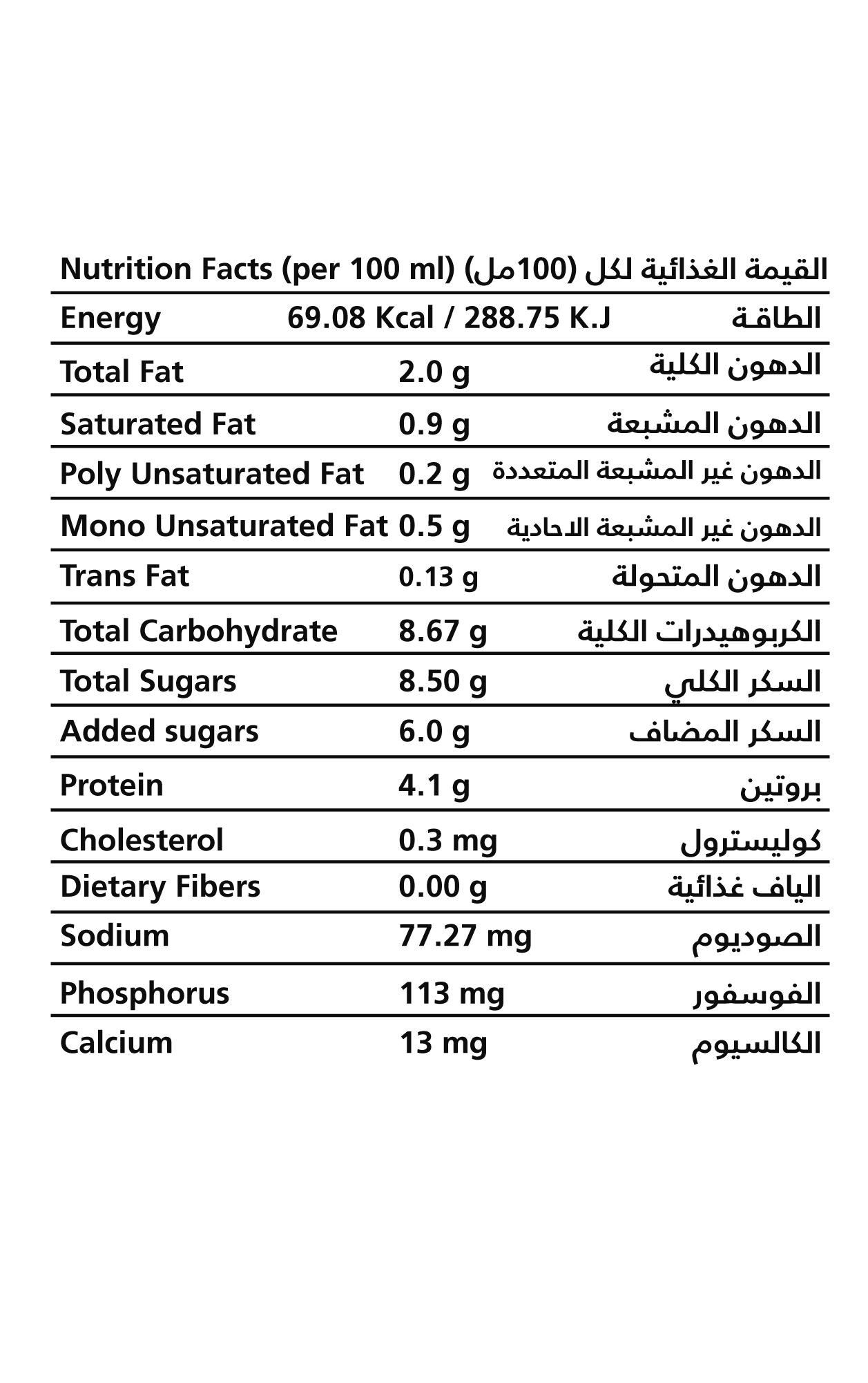 المكونات: مسحوق حليب بقري، سكر، ماء نقي، بودرة الكاكاو، مستحلب ومثبت مصرح به(أسيتيلاتد ثنائي النشا أديبات إي1422، أميدات البكتين إي440، أحادي و ثنائي جليسريدات الأحماض الدهنية من زيت النخيل إي471، ألجينات الصوديوم إي401، أجار إي406)، نكهة الشوكولاتة المماثله للطبيعة، يحتوي على 2% دسم كحد أقصي ، 8.5% كحد أدنى مواد صلبة حليبية لا دهنية، ومدعم ب 400 وحدة دولية من فيتامين (د) و 1320 وحدة دولية من فيتامين (أ) لكل لتر.