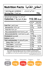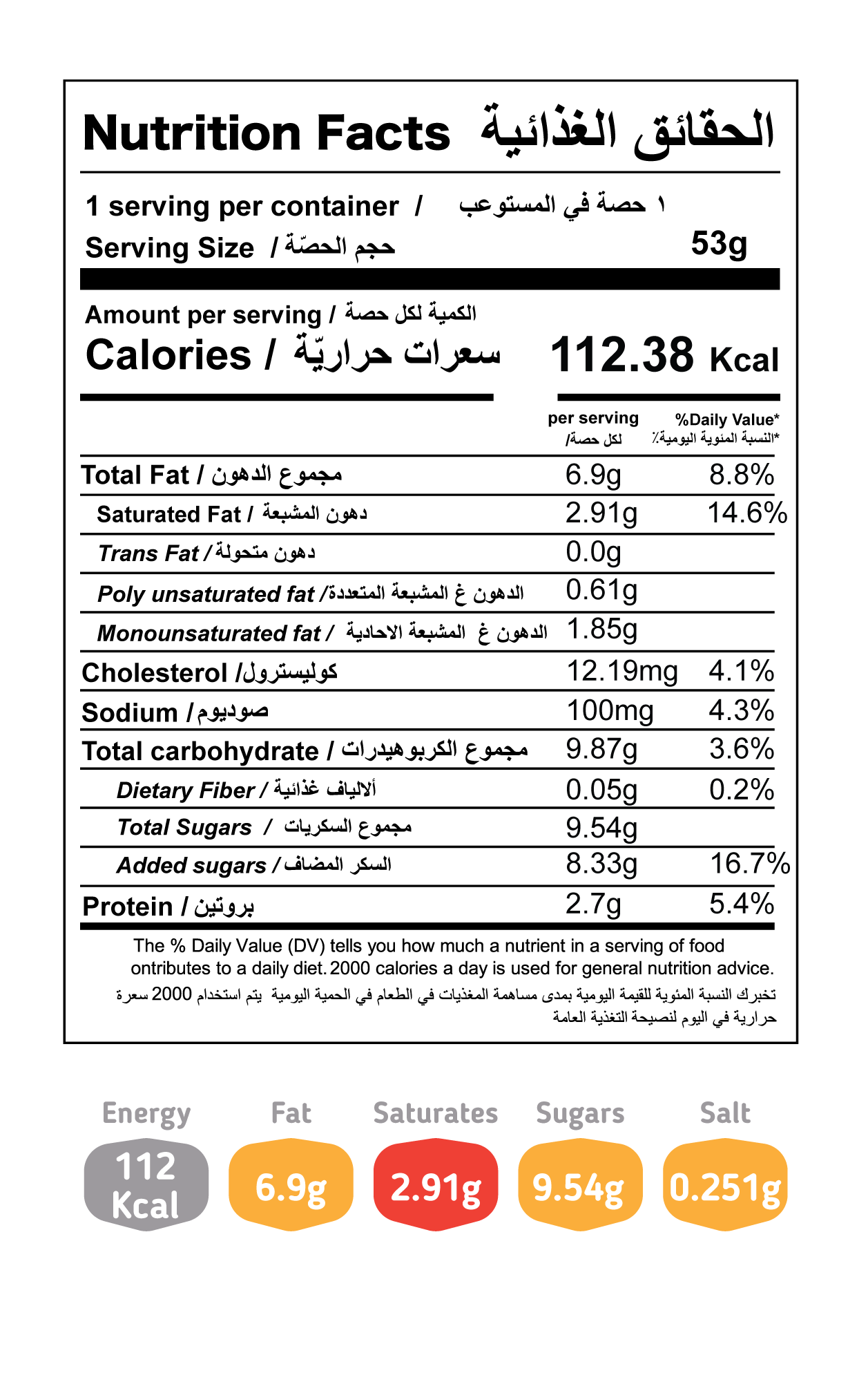 المكونات: ماء نقي، سكر، دهن نباتي، حليب بقري مقشود ومجفف، بودرة الكاكاو، مثبتات ومستحلبات طبيعية:صمغ حبوب الخروب، إي407، إي 410، إي 412، إي 466، إي 471 (زيت النخيل)، إي 477 (زيت النخيل)، نكهة الشوكولاتة المطابقة للطبيعة، نكهة الفانيلا المطابقة للطبيعة، الوان طبيعية: لون الأناتو (١٦٠بي)، لون الكراميل ( إي ١٥٠أ)، ألوان مصرح بها: (إي ١٣٣، إي١٥٠سي ، إي ١٥١، إي ١٥٥). معلومات الحساسية: يحتوي على الحليب ومنتجاته، كاكاو.