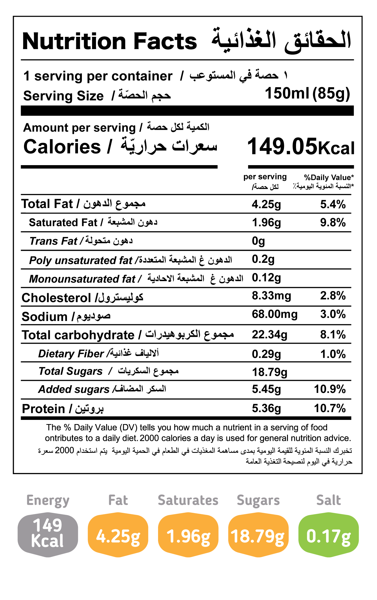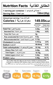 المكونات: حليب بقري طازج، ماء نقي، سكر، حليب بقري مقشود و مجفف، دهن نباتي، معجون التوت البري (مع نكهات التوت البري الطبيعية والمماثلة للطبيعة، الوان غذائية: إي ١٦٣، إي ١٣٢)، بادئ (مستنبت بكتيري)، مثبتات ومستحلبات: (صمغ حبوب الخروب، صمغ الجوار، إي٤٧١ (من زيت النخيل)، إي 477 (من زيت النخيل)، منظم حموضة: حمض الستريك، نكهة الروب المماثلة للطبيعة. معلومات الحساسية: يحتوي على الحليب ومشتقاته. يحـفظ مجمداً (-18م°)، السعة 150 مل .