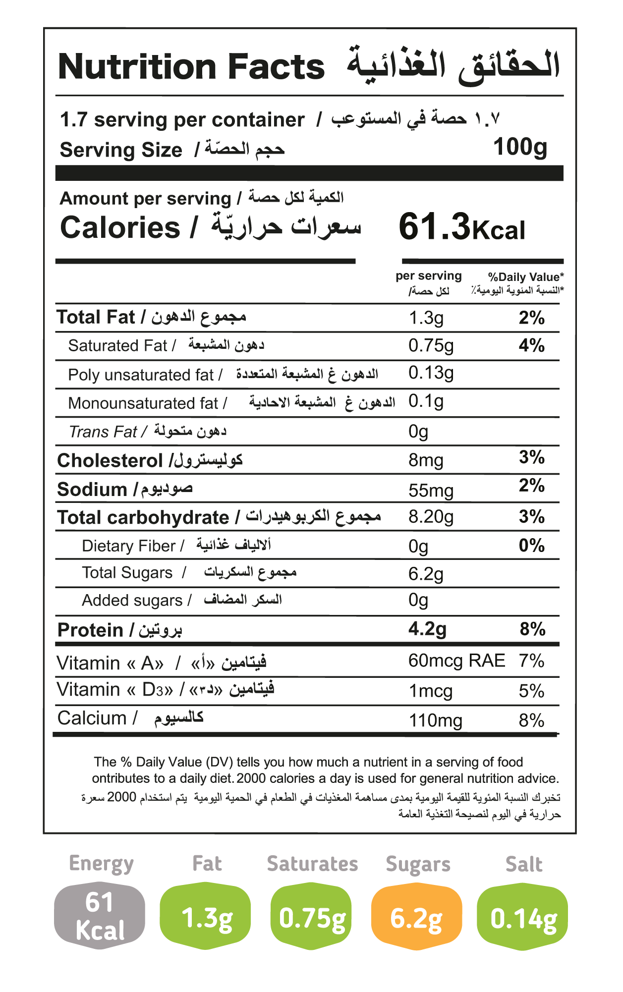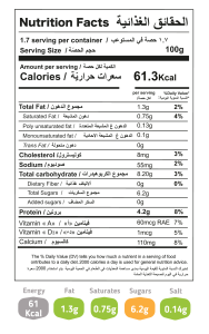 المكونات: حليب بقري طازج، جوامد الحليب، بريبايوتيك عضوي (صمغ عربي إي ٤١٤ من اكاسيا السنغال)، مثبت ومستحلب: بكتين، إي ٤٧١ (نباتي)، فيتامينات أ و د٣، بادئ مستنبت بكتيري، دهون ١.٥٪ حد أقصى، مواد صلبة حليبية لا دهنية ٨.٥٪ حد أدنى، روب طازج محضر من حليب بقري نقي ١٠٠٪. معلومات الحساسية: يحتوي على الحليب و منتجاته.