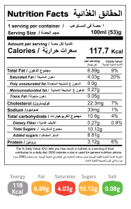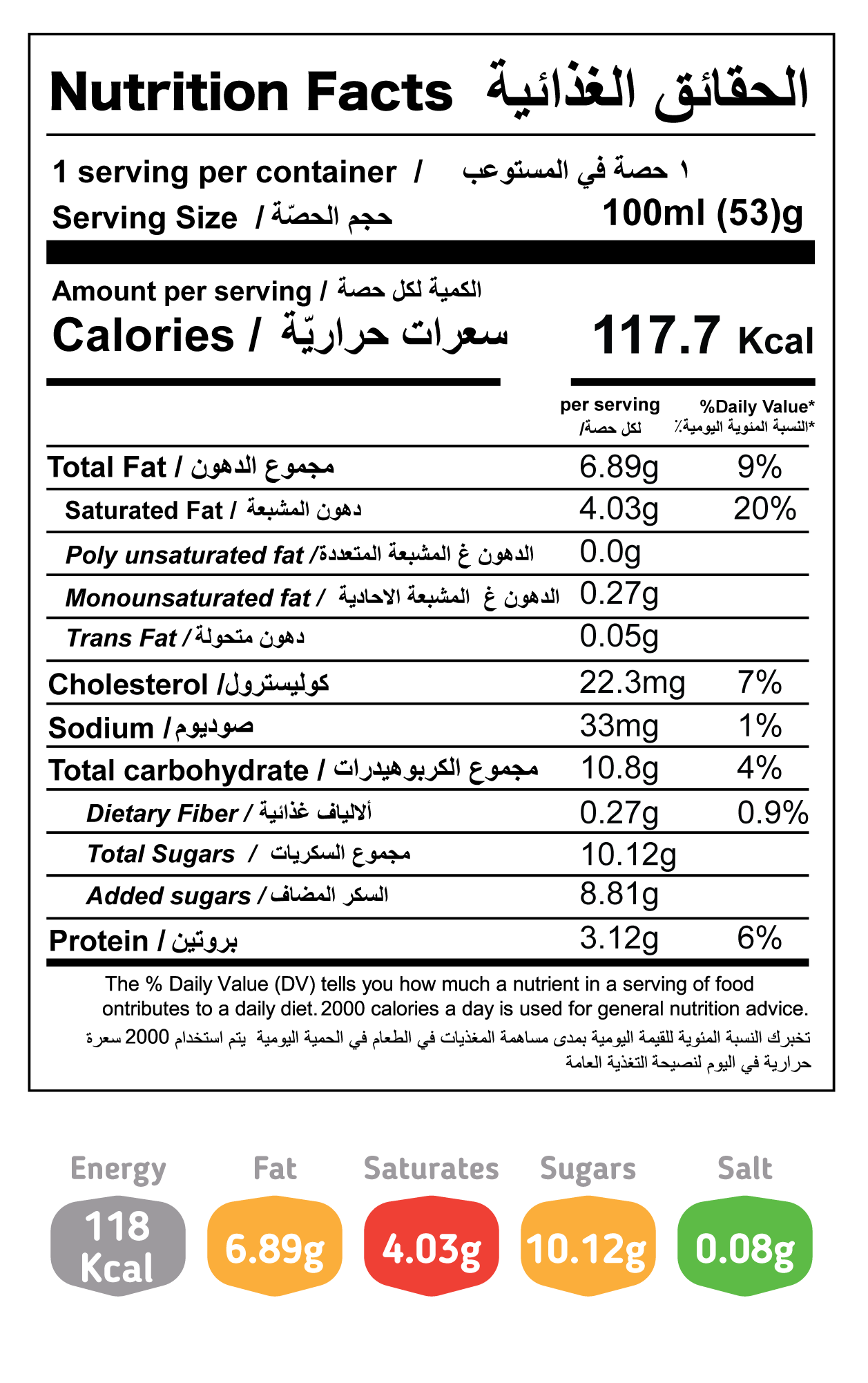 Ingredients: Purified Water, Skimmed Milk Powder, Sugar, Vegetable Fat, Cocoa Powder, Coconut Powder, Natural Emulsifiers, and stabilizers: E407, E410, E412, E466, E471 (Palm oil), E477(Palm oil), Approved colors: (E133, E151, E155).