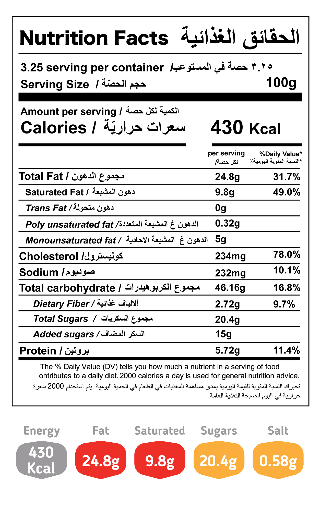 Ingredients: Wheat flour, Filtered water, Sugar, Fresh eggs, Cow’s milk whey solids, soya flour, Dextrose, Corn starch, Wheat gluten, Shredded coconut, Chia seeds, Thickener (E1422), Soybean oil, Raising agents ( E541,E500), Salt, Emulsifiers (E471, E477, E481-Palm based), Egg powder, Nature identical coconut flavor. Allergen information:(Milk, Milk derivatives, Gluten, Eggs, soya).