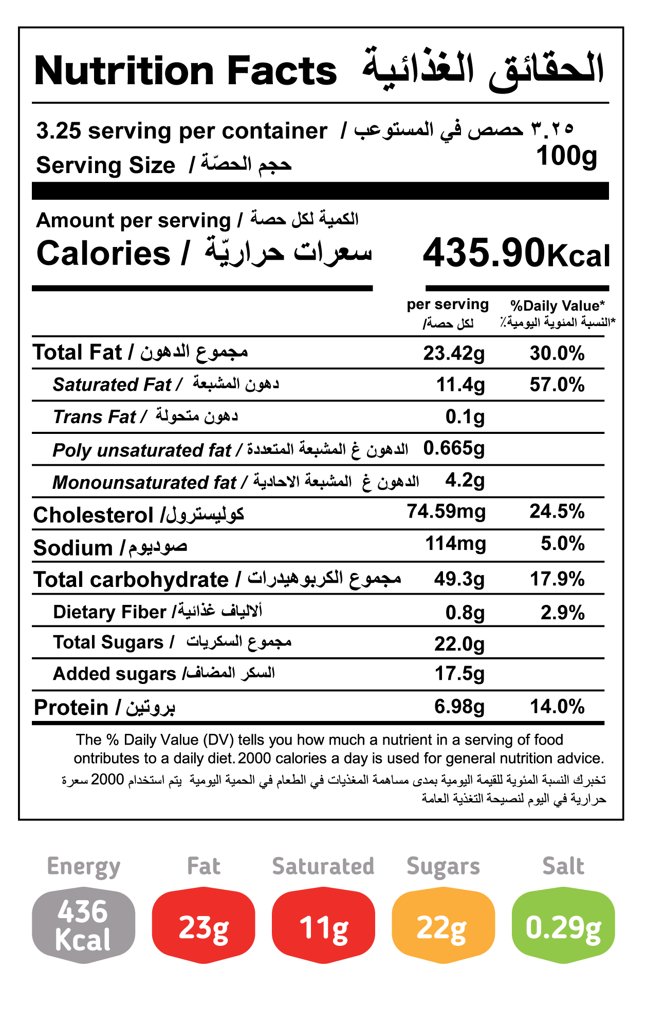 Ingredients: Wheat flour, Sugar, Fresh eggs, Butter, Vegetable shortening, Purified water, Glycerin, Cow’s Skimmed milk powder, Dextrose, Corn starch, Baking powder, Glucose, Salt, Natural identical vanilla flavor, Potassium sorbate, Citric acid, Vegetable emulsifier: mono and Diglycerides of fatty acids(from palm oil ) . Allergen information: Contains (Milk derivatives, Gluten, Eggs)