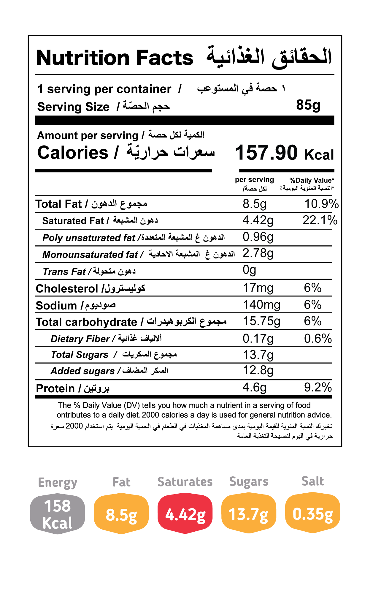 Ingredients: Purified water, Sugar, Vegetable fat, Cow’s skimmed milk powder, strawberry puree, Dextrose, Citric acid, Natural identical vanilla flavor, Natural Emulsifiers, and stabilizers: E407, E410, E412, E466, E471 (Palm oil), E477(Palm oil), natural colors: Annatto (E160b), Beet red color(E162), Caramel color (E150a). Allergen information: Contains Milk, and its Products. Content (150ml) ,Keep Frozen (-18ºC).